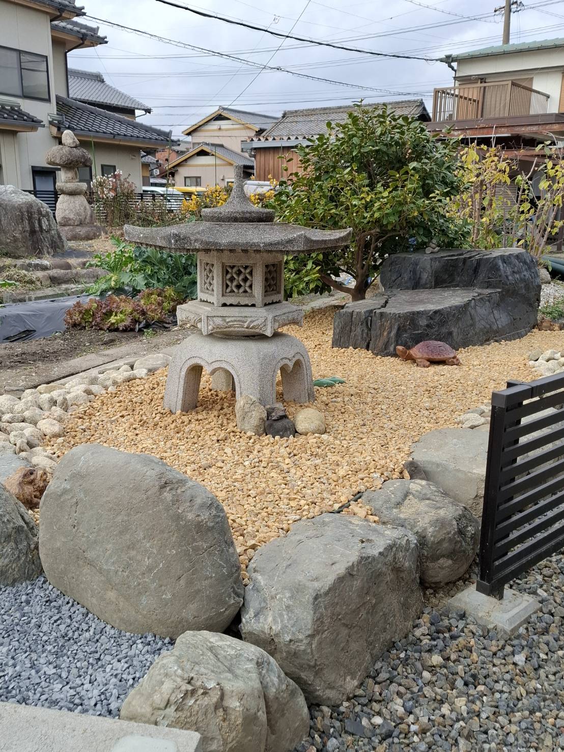 施主様ご夫婦ともに知識豊かな方で相談しながら、既存のフェンスや石を利用して畑の延長・灯篭を移動してのお庭造りをさせて頂きました。