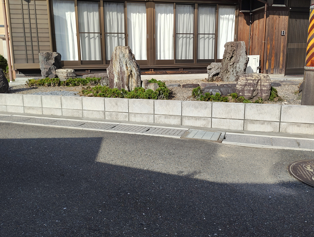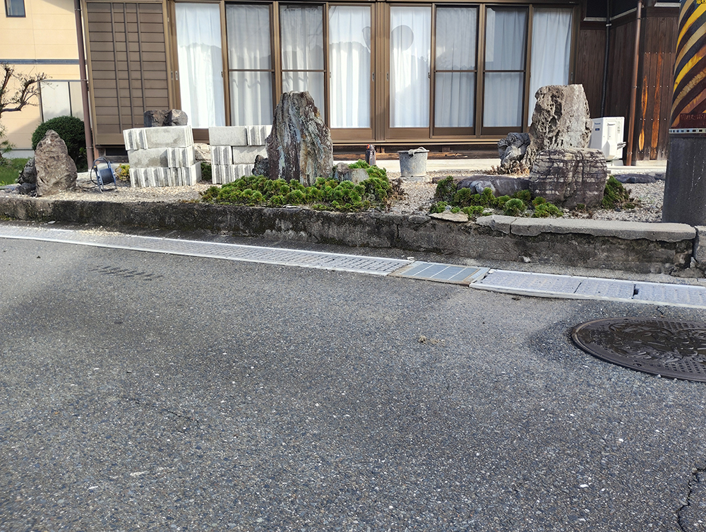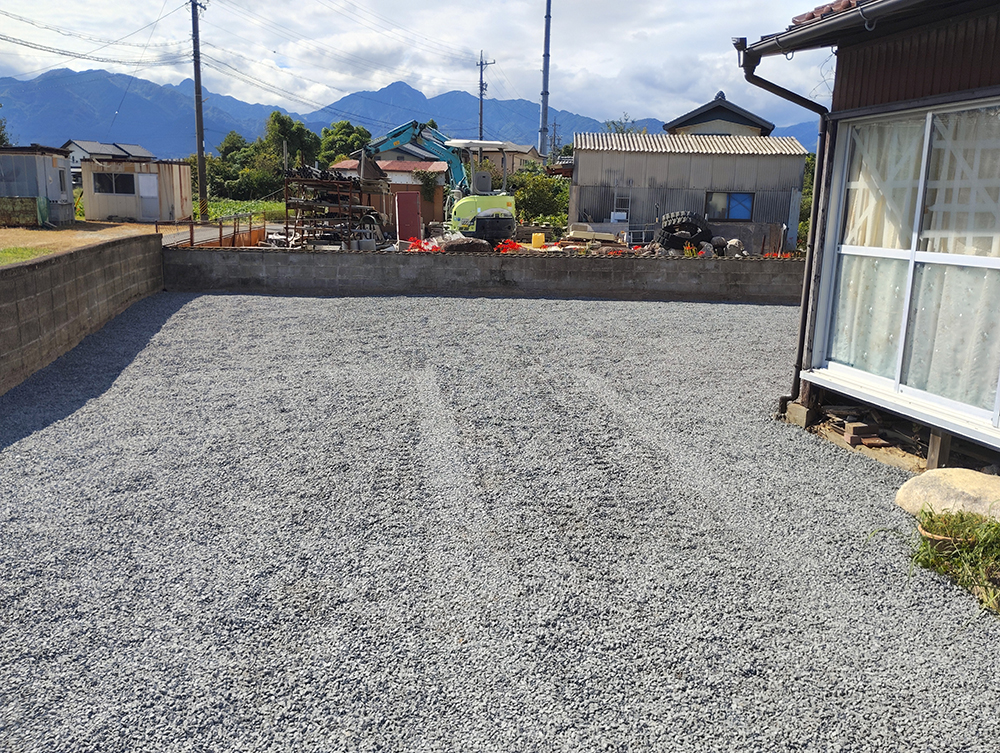 気になる植木を伐採して胸程伸びた雑草を刈り取って処分し、自社のユンボにて草の根・土を除去・整地をして防草シートを敷き、砂利を撒いて仕上ました。